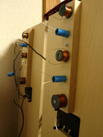 側板、底板、天板をそれぞれ接着している間にネットワークの方も作っていく。クロスオーバー周波数は3KHz、600Hz辺りを狙って高域・低域・超低域と3つに分ける。実際手に入る電子部品からするとちょっとずれるけども、厳密にやってもそんなに意味はない。組み立てには汎用の基盤を使ってみようかとも思ったが、パーツを直接つなぐ方が手軽なので、適当な電気コードを切って半田で固定する。サブウーファー用に使うユニットはインピーダンスも能率も不明だが、まあ極端にずれているとも思えないので組み上げてから考えればいい。