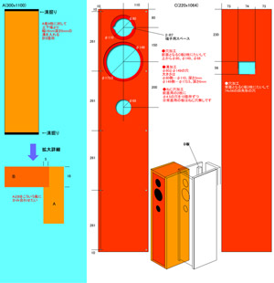 トールボーイ型にするとして、内部的にどうするか、市販のスピーカーをよく見てデザインを練る。密閉式、バスレフ式とバックロードホーン式と色々があるが、できるだけLSF-555のパーツを再利用したいのでバスレフ方式を選択した。