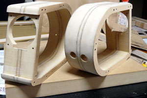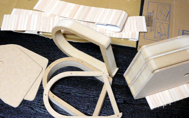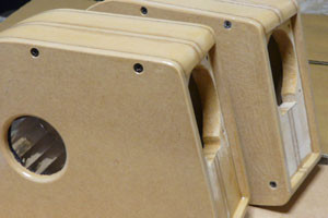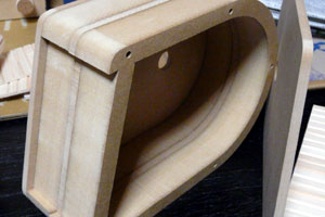 このスピーカーは曲面があるために平面の板の箱組では作れない。ということで縦に輪切りにした形を切り出し、重ねて作ることにした。ユニットの幅が65mmなのでそれに合うよう30mmと5.5mmのMDFを使い、上の写真のようにカットしてもらった。板材は全部足しても2000円もいかないが、複雑なカットを頼んだせいで工賃が15000円くらいかかった。東急ハンズでやってもらったのだが、あそこは機械加工ではないので重ねてアラぴったりというわけにはいかなかった。ネジ穴なんかずれすぎて締めることが出来ない。もうすこし予算を上げて高精度カットのところに頼めば良かったかな…。