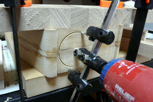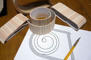 螺旋部分は印刷した紙を板に当てて写し取り、その線に沿って上の写真のような曲がる板を貼り付けていく。今回この曲がる板が無かったらこのスピーカーは製作できなかった。ちなみに曲がると言っても正確に言うと細切りの板がシールでまとめられてだけであり、完全な曲面というわけではない。板は薄いし、曲がる部分はシール一枚分の厚さしかないから強度もそんなにあるわけではない。精密な金型を作って樹脂などで一体成型できるならもっと設計図通りに作れるんだろうけど、この辺は素人の工作だけに妥協しまくり。どっかのメーカーが作ってくれないかな。