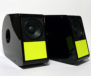 箱のデザインは、15度に傾斜したフロントと、渦巻きの一部となる曲線の組み合わせで、横から見るとDの字になっている。元々M3をイメージしていたこともあってフロントの方は似た形をしている。色合いは木目にするか黒く塗るか悩んだが、黒と黄色の組み合わせに落ち着いた。auのlottaという携帯がモチーフ。どうでもいいがlottaは数字があしらわれていなければもっと売れそうな気がする。構想段階ではフロントバッフルに文字を印刷しようともくろんでいたが、製作期間の短さから断念している。