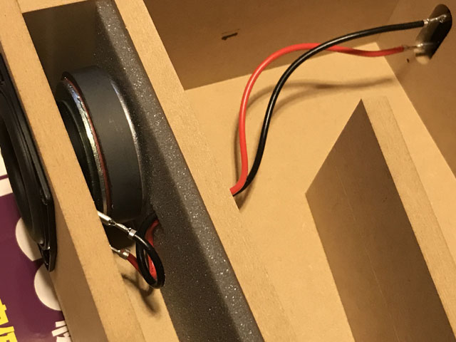 自作の経験があれば簡単に組めます。マイナス側のファストン端子はかみ合わせがちょっとキツく、プラス側の広い端子はちょっと緩め。吸音材のスポンジはビリっとやぶって線を通します。スペースが小さいのでペンチがあるといいですね。