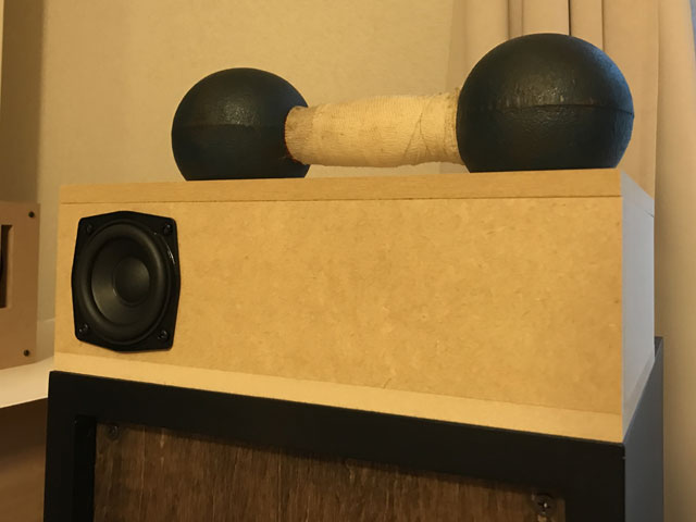 反対側の側板はまだ接着せず鉄アレイを乗っけて横置きで聞いてみました。